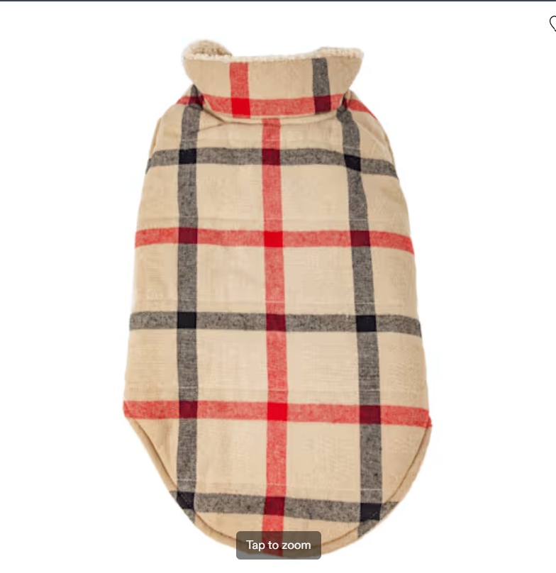 - - Features a nice fashion designer plaid design along the back with a matching collar that's reversed with Fleece
